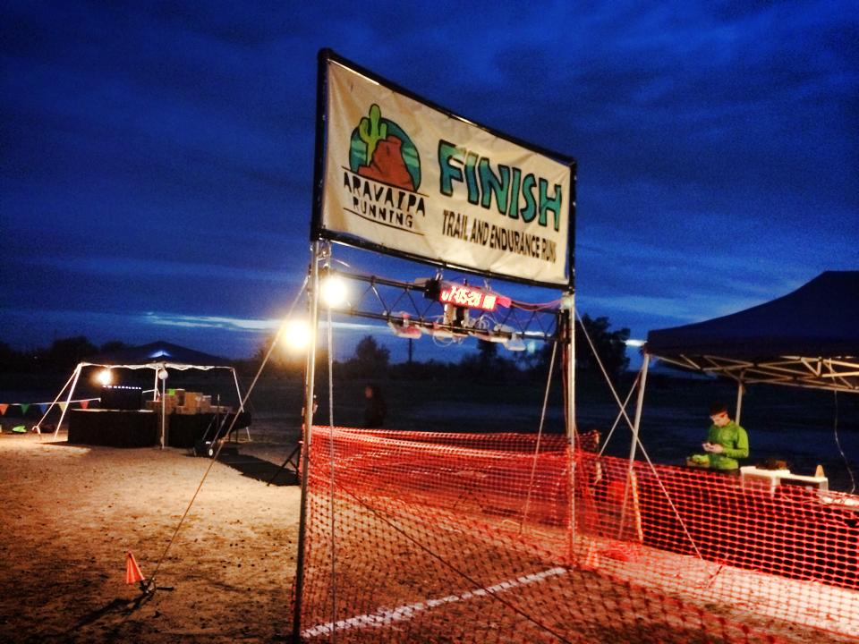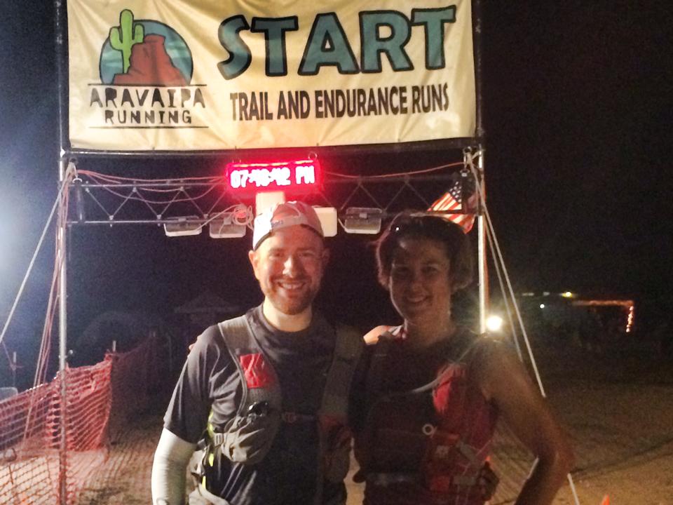 Getting ready for our last and shortened loop, we threw an additional layer in our packs and got our headlamps ready as the sun would soon be setting. With the sun coming down, the desert quickly started to cool and we found our third or fourth wind running some fast miles! Unfortunately, some of the other runners had not planned as well and we came upon some runners wandering the path without any lights clearly struggling to locate the course. We slowed to a hike so that they could fall in with us and got them to an aid station where some friendly volunteers loaned them an emergency flashlight so that they could get back to the start/stop and their drop bags. With our new friends safe and with working lights, we were free to move on and picked up the pace knowing that we only had four miles to our finish. With the exception of the major hills, we ran it in strong passing several runners along the way and cruised in with a 12:17:29 finish time. After crossing the line and taking the obligatory picture, we looked at each other and commented that we felt great and could easily go out and do another loop or two!