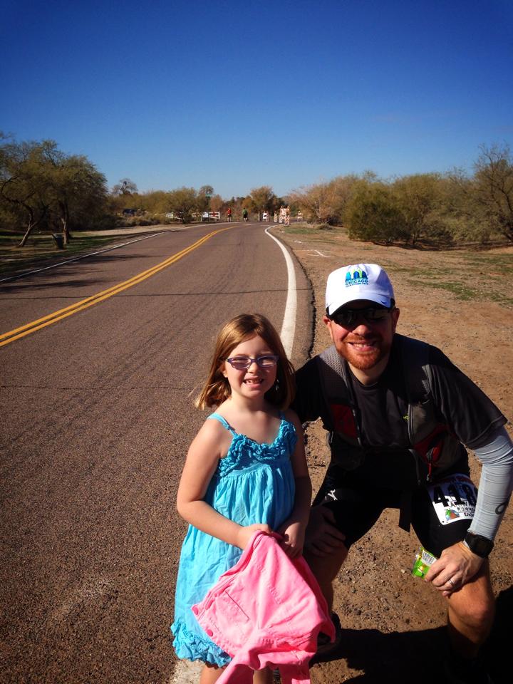 We started off on our run at 7:30am just as the sun was starting to come out and settled in for a day playing in the sand. The first couple miles were great with some nice rolling hills getting us into the mountains and in no time, we were at the first aid station approximately 4.5 miles. The 7 mile section after the first aid station was challenging with nearly a three mile stretch of sand running and a 1.5 mile climb on a rock/boulder filled trail so the 11 mile aid station was a welcome sight with cold water and plenty of goodies to eat. The next 5 mile section was by far the most runnable of the course and we clicked off some of our fastest miles in the morning before the sun was completely up. With a quick stop at the 16.5 mile aid stop, we were in the home stretch of the loop which featured the two steepest/sharpest climbs including one that was hands on knees stair climbing tough. It was here that we hit the highlight of the race – seeing my daughter and parents as we hit the summit of the last climb. They had not only made the effort to drive to the race but had even hiked onto the course to see us in action! I was already feeling great and this topped it off. We finished off the first loop in 4 hours even and took a slightly long stop at our drop bags to reapply sunscreen, refuel and fill our water packs knowing that the next loop and the mid-day sun and temperatures would be challenging.