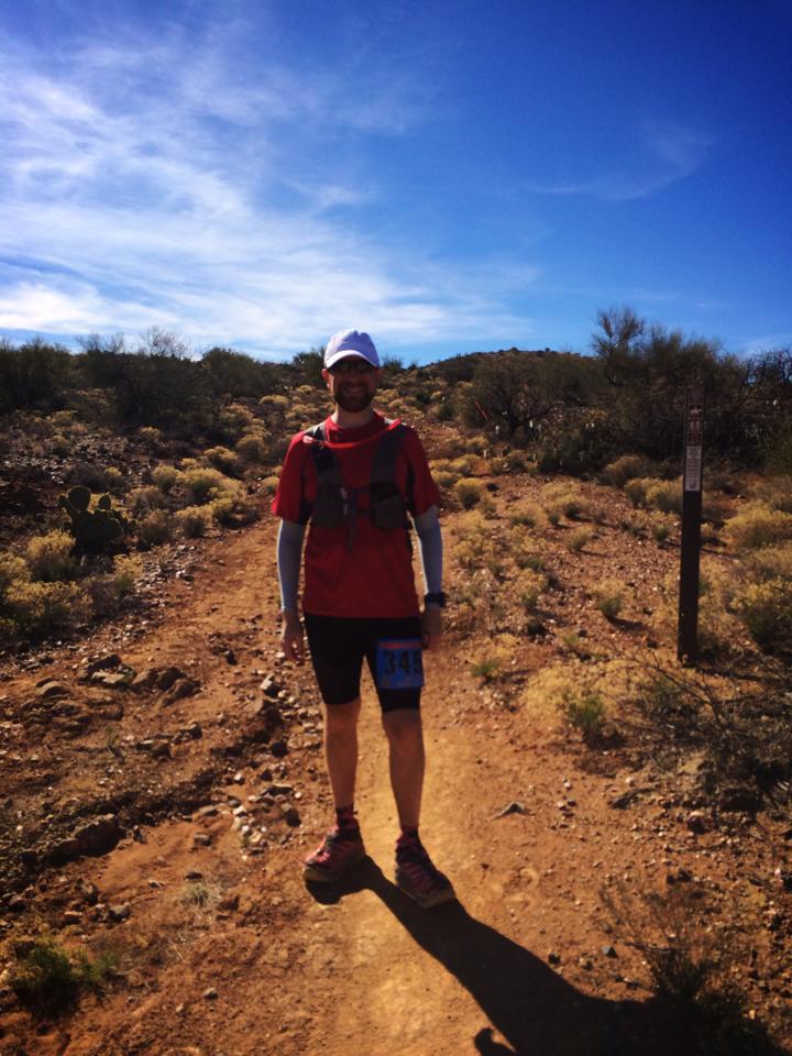 After a couple miles on the road, we made it to the trailhead and started our now ~60 mile journey south towards Phoenix. The altitude at the start was several thousand feet higher than Phoenix and the temperatures were still very cool so I made the silly decision to start in a lightweight running jacket. Within 15 minutes of the race start, the sun had risen and the temps climbed from the upper 40s up QUICKLY. The race had been scheduled in February because the temperatures are seasonably cool but Phoenix had been going through a warm spell and the forecast called for temperatures in the higher 80s potentially even touching the lower 90s. With all of my recent training having been in Chicago, the temperatures were going to be a challenge – potentially more so than the distance.