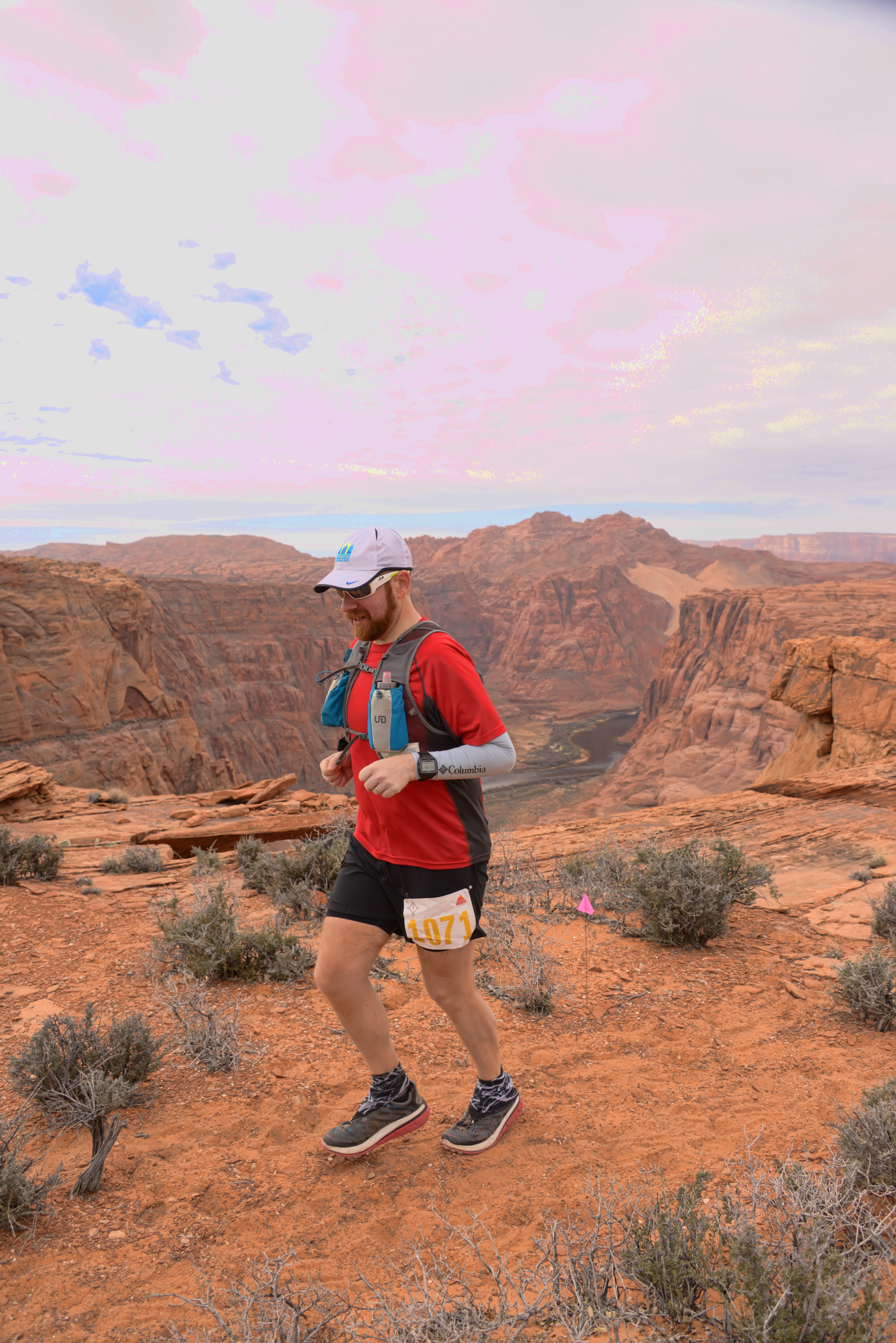 Coming into Horseshoe Bend Aid, I knew that we had approximately eight miles on the most technical terrain of the course so I made sure to fill both bottles and empty both shoes before pressing on. We ran approximately a half mile past the aid station before arriving at the edge of a cliff at the Horseshoe Bend of the Colorado River. To say that the views were stunning would be a complete and total understatement.