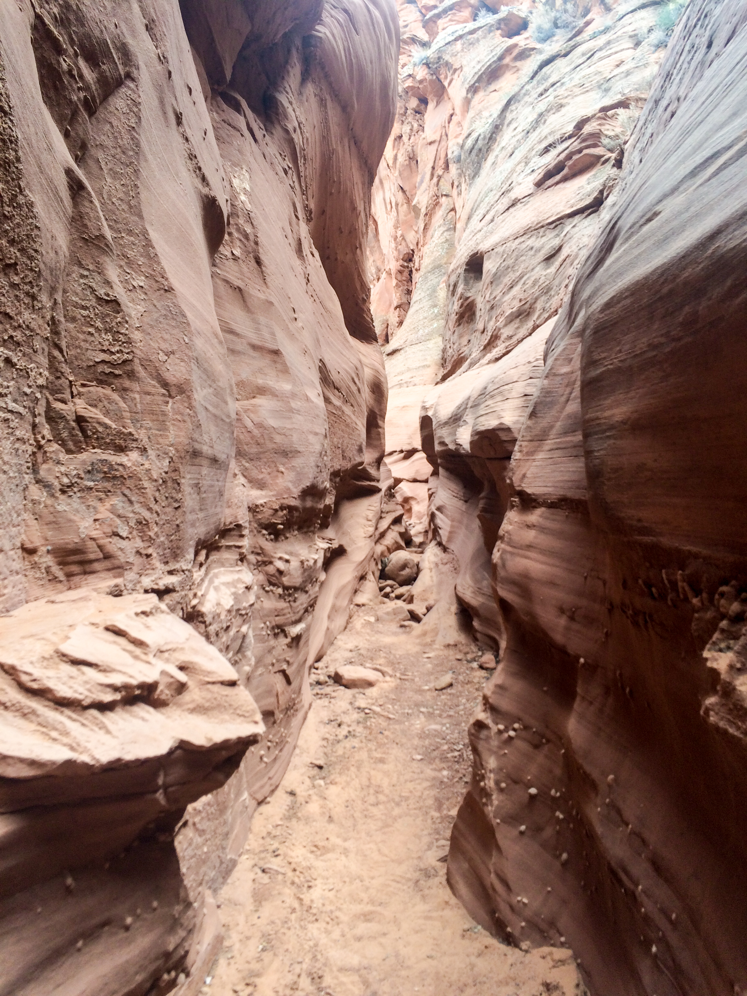 Eventually, we started to move away from the canyon wall. I fell in with a couple strong runners doing the 100 mile race. Jamie and Andrea were moving well and we chatted about the race so far along with their plans for the loop/night section. We all commented about how difficult the course had been and hoped for just a few ‘runable’ miles. We made it to Waterholes Aid station and were relieved to refuel a bit before moving on. My GPS (Garmin 910xt) is generally super accurate but had lost satellite coverage numerous times during the slot canyons. I was pleased when the aid station volunteers reported that we were actually at mile 28.5 rather than the 27.2 I was showing. Leaving the aid station, we were told that we had a steep descent into another slot canyon followed by a sandy climb to the high point of the course. That guidance proved to be spot on. Crossing the road, Jamie and I found a 200ft DROP that we had to scramble down. I’m an adventurous guy and enjoy climbing but I had more than a marathon on my legs and this was some pretty technical stuff. There was some jumping. There was some dropping. There was some butt sliding. Eventually, we made it to the bottom and the mouth of a very cool slot canyon.