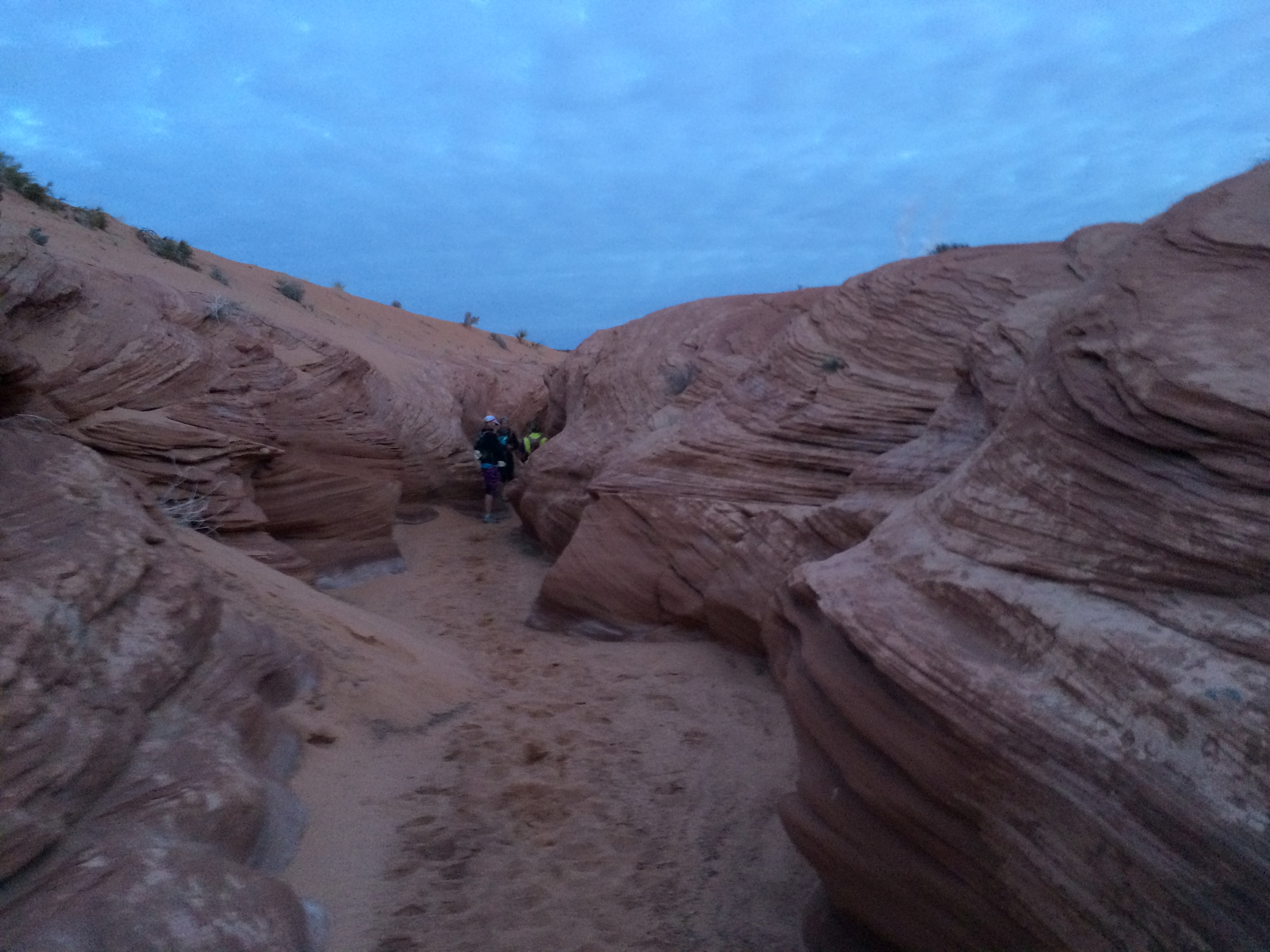 With hundreds of headlamps bobbing up and down, we started off at 6a sharp. After what seemed like maybe 1/16 of a mile of running, we were dumped onto some technical slickrock. Some early conga lines formed but it certainly helped to moderate the early pace. After a bit of climbing, we were tossed onto a sandy double track section which we ran for about four miles. The course was soft but you couldn’t really see how soft it was in the darkness. After about four miles, we took a sharp nearly 180* turn and were at the mouth of our first slot canyon. The sun was just starting to rise and the desert had that classic pinkish glow to it.